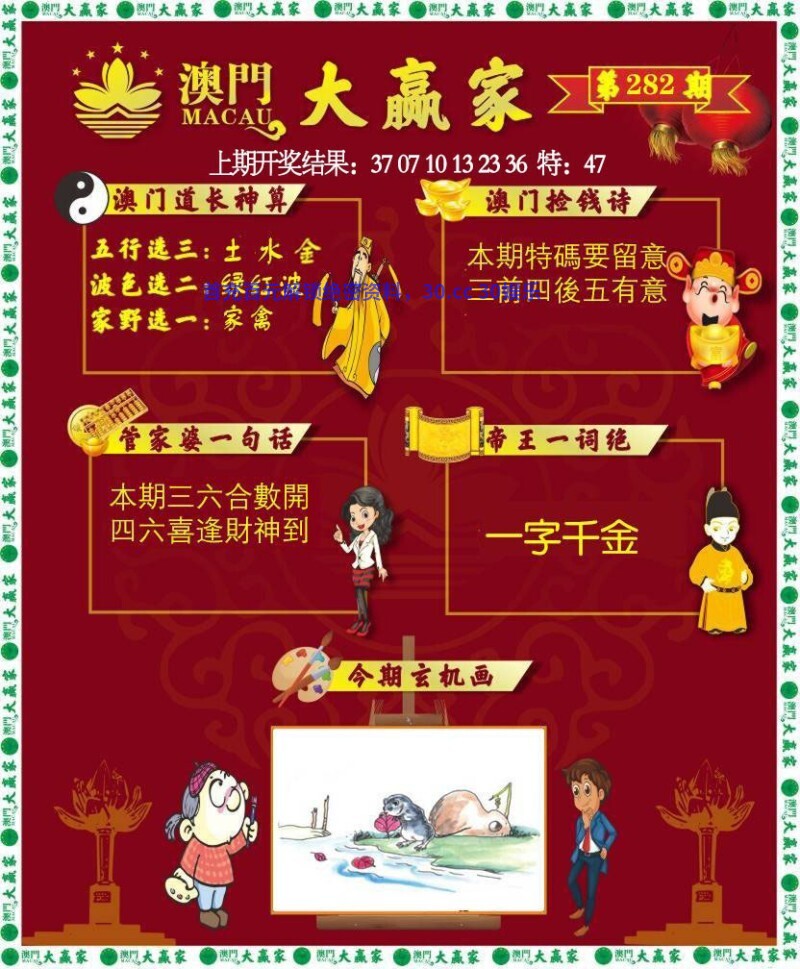 272期:本期生肖二五开,二三门看特有钱。土木之数中特码,将军君王一声怒。变幻莫测显神功,一举两得猪中计。牛羊马猪中特奖,双喜临门一大篇。 |